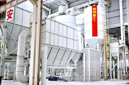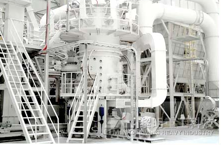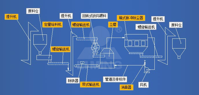 經(jīng)破碎和嚴(yán)格除鐵后的原料,經(jīng)斗式提升機(jī)進(jìn)入原料倉堆放。在事先設(shè)定給料量的情況下,定量給料機(jī)稱量物料并把物料經(jīng)提升和輸送設(shè)備喂入LUM超細(xì)立式磨機(jī)內(nèi)進(jìn)行粉磨,在此過程中定量給料機(jī)的電腦記錄累積給料量,并顯示在屏幕上。回轉(zhuǎn)式鎖風(fēng)喂料機(jī)可使超細(xì)立磨在進(jìn)料的同時(shí),避免多余的空氣進(jìn)入磨內(nèi)。合格成品粉的收集由一臺(tái)箱式脈沖布袋除塵器完成,減少了設(shè)備臺(tái)數(shù),簡化了系統(tǒng)配置。成品粉收集后用螺旋給料機(jī)通過其它輸送設(shè)備送至成品料倉或直接包裝。有少量未經(jīng)粉磨的物料,經(jīng)返料皮帶機(jī)回到給料機(jī)中,重新進(jìn)入超細(xì)立磨進(jìn)行粉磨。在經(jīng)過皮帶機(jī)時(shí),少量的鐵會(huì)被除鐵器吸住,使超細(xì)立磨能夠安全運(yùn)行。