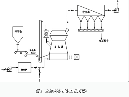 經(jīng)破碎后的石灰石由庫底調(diào)速皮帶秤計(jì)量配料后,由皮帶輸送機(jī)喂入立磨進(jìn)行粉磨,成品為細(xì)度250目石灰石粉。粉磨后的石灰石粉經(jīng)輸送機(jī)送入成品庫儲(chǔ)存。儲(chǔ)庫庫頂設(shè)有單機(jī)收塵器除塵。