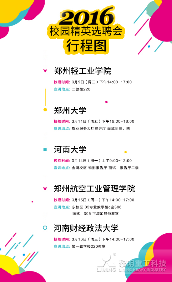 在接下來的一段時間內(nèi),黎明重工HR團隊將相繼走進鄭州輕工業(yè)學院、鄭州大學、河南大學、鄭州航空工業(yè)管理學院及河南財經(jīng)政法大學等知名學府展開2016校園招聘宣講會,歡迎大家參加。屆時您將可以近距離與我們的HR交流更多詳細信息。