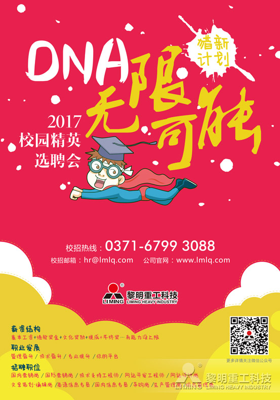 “傲青春·夢(mèng)想飛揚(yáng)季”、“傲青春·夢(mèng)想綻放季”、“下一站,黎明”,“獵新計(jì)劃——青年青年站出來(lái)”,“獵新計(jì)劃——趁年輕,干漂亮的事兒”這些主題鮮明的精英選聘會(huì)讓學(xué)子們印象深刻。每一場(chǎng)的宣講,每一次的熱忱溝通,每一站的追隨,黎明重工吸引了各大高校佼佼者的加入,成為這個(gè)群體中口口相傳的企業(yè)。“獵新計(jì)劃——DNA無(wú)限可能”2017黎明重工春季校園精英選聘會(huì)如期啟動(dòng)。
