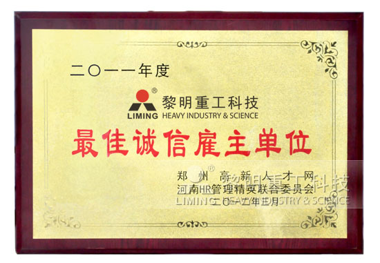 2012年4月15日,“中高協(xié)·鄭州”高新人才發(fā)展年會(huì)暨河南HR管理精英聯(lián)合委員會(huì)第六屆聯(lián)誼峰會(huì)開幕,來自中國高新區(qū)協(xié)會(huì)人力資源協(xié)會(huì)、中原地區(qū)知名企業(yè)、河南HR領(lǐng)域具有影響力的領(lǐng)導(dǎo)參與了此次峰會(huì),隆重表彰2011年度在中原地區(qū)人力資源管理及開發(fā)領(lǐng)域取得優(yōu)異成績的企業(yè),河南黎明重工科技股份有限公司榮獲2011年度誠信雇主單位。