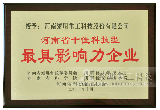 2011年度河南省十佳科技型企業(yè)(企業(yè)家)評選結(jié)果揭曉,黎明重工科技喜獲“河南省十佳科技型具影響力示范企業(yè)”榮譽(yù)稱號。