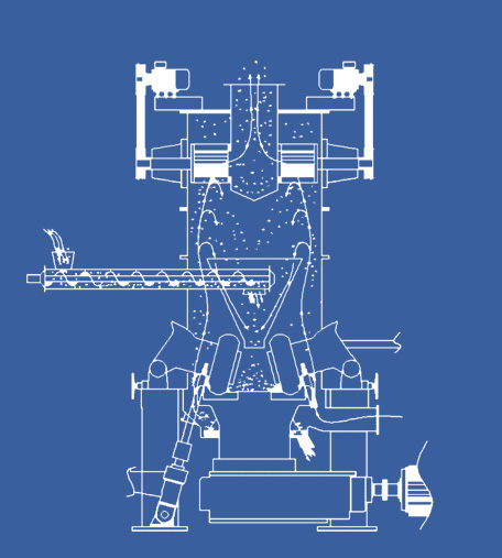 主電機通過減速機帶動磨盤轉(zhuǎn)動,同時風從進風口進入LUM超細立式磨機,物料經(jīng)螺旋給料機下料口落在磨盤,在離心力的作用下,物料從磨盤向邊緣均勻移動,經(jīng)過磨盤上的粉磨輥道區(qū)域時,受到磨輥的碾壓,大塊物料直接被壓碎,細粒物料受擠壓后形成料床進行粒間粉碎。被粉碎的物料繼續(xù)向磨盤邊緣移動,直到被風環(huán)處的強氣流帶走,而較大的顆粒物料又重新掉落到磨盤上繼續(xù)粉碎,氣流中的物料經(jīng)過上部的分離器時,在轉(zhuǎn)子葉片的作用下,粗顆粒重新回到磨盤上粉磨,合格的細粉隨氣流一起出磨,被系統(tǒng)的集粉器收集,被收集到的粉料即為超細立磨磨出的產(chǎn)品?;烊胛锪系蔫F塊等雜物隨物料運動到磨盤邊緣時,由于自身重量大而不能被風吹起,跌落至磨機下腔被安裝在磨盤底部的刮料板刮入排渣口排出機外。