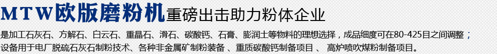 是加工石灰石、方解石、白云石、重晶石、滑石、碳酸鈣、石膏、膨潤土等物料的理想選擇,成品細(xì)度可在80-425目之間調(diào)整;設(shè)備用于電廠脫硫石灰石制粉技術(shù)、各種非金屬礦制粉設(shè)備、重質(zhì)碳酸鈣制備項(xiàng)目、高爐噴吹煤粉制備項(xiàng)目。