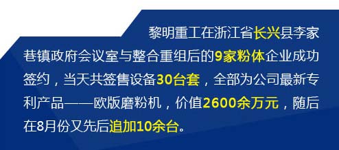 2012年3月20日,黎明重工與整合重組后的9家粉體企業(yè)成功簽約,當(dāng)天共簽售歐版磨粉機(jī)30臺套,價值2600余萬元,隨后在8月又先后追加10余臺,基本囊括了所有粉體設(shè)備的訂單。